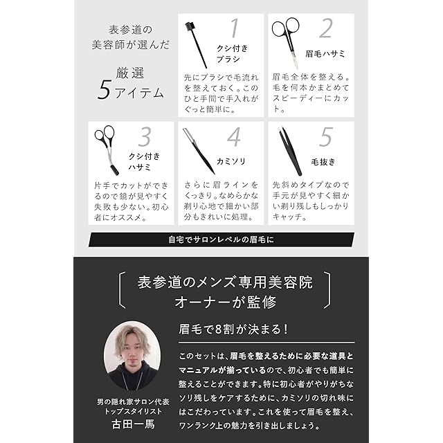 [Omahit] 眉毛 ハサミ はさみ メイクアップセット 眉毛剃り 毛抜き くし 顔剃り メンズ 説明書付 表参道メンズ美容師監修 (ブラック)